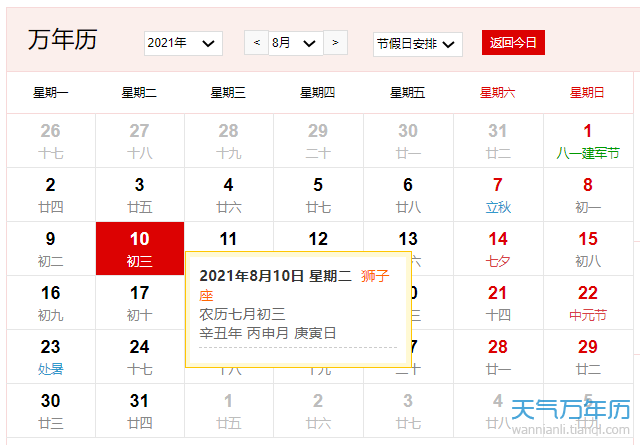 21年8月10日是什么日子21年8月10日有什么节日 万年历